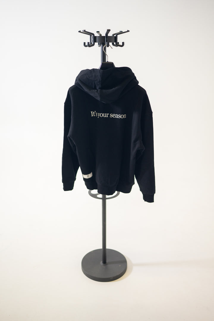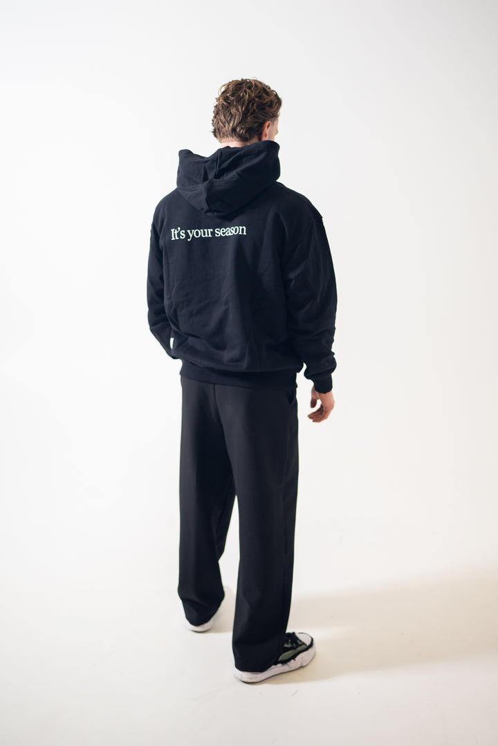 Step into confidence with our black hoodie featuring the empowering slogan "It's your Season" boldly displayed on the back. Designed for both comfort and motivation, it includes a distinctive white label on the lower left, adding a subtle yet stylish detail to this everyday essential.